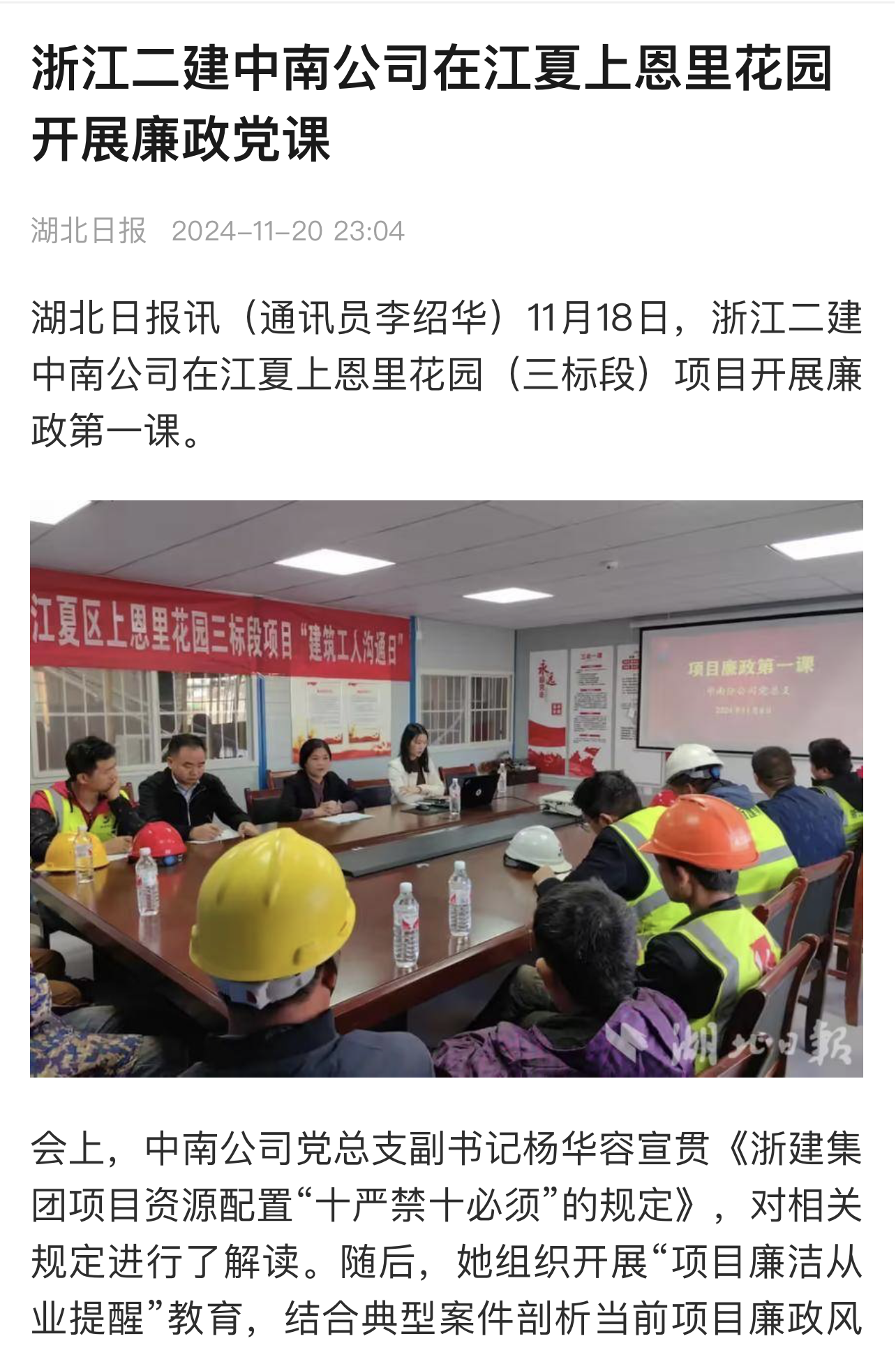 11月18日,浙江二建武漢市江夏上恩里花園(三標(biāo)段)項目開展廉政第一課活動,增強項目管理人員廉潔從業(yè)意識,深化廉潔風(fēng)險防控,推動項目依法合規(guī)經(jīng)營。相關(guān)情況獲湖北日報客戶端報道。
