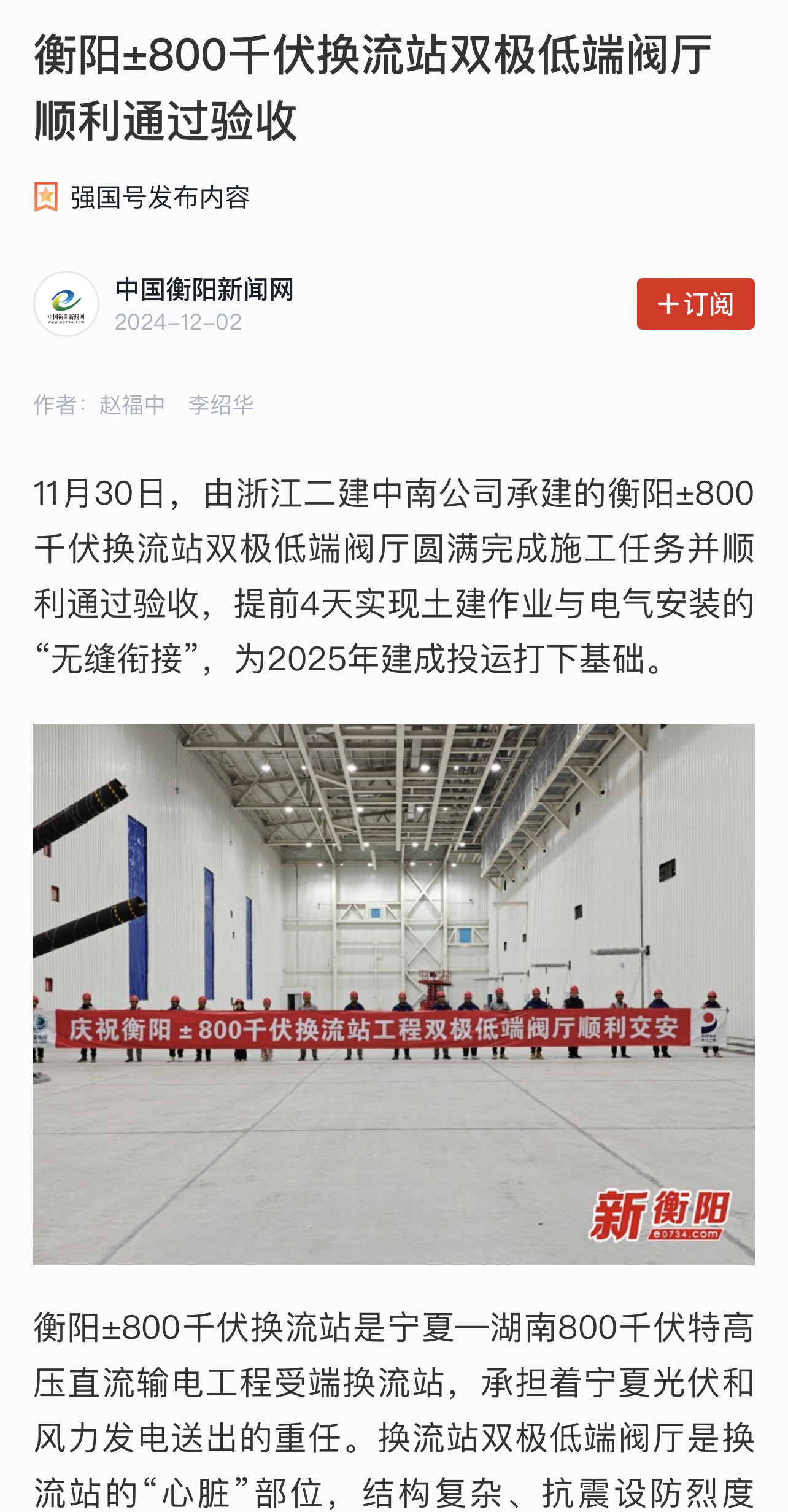 近日,中南分公司承建的湖南衡陽±800千伏換流站雙極低端閥廳圓滿完成施工任務(wù)并順利通過驗收,提前實現(xiàn)土建作業(yè)與電氣安裝的“無縫銜接”,為2025年建成投運奠定基礎(chǔ)。相關(guān)情況獲學(xué)習(xí)強(qiáng)國、中國衡陽新聞網(wǎng)等媒體報道。
