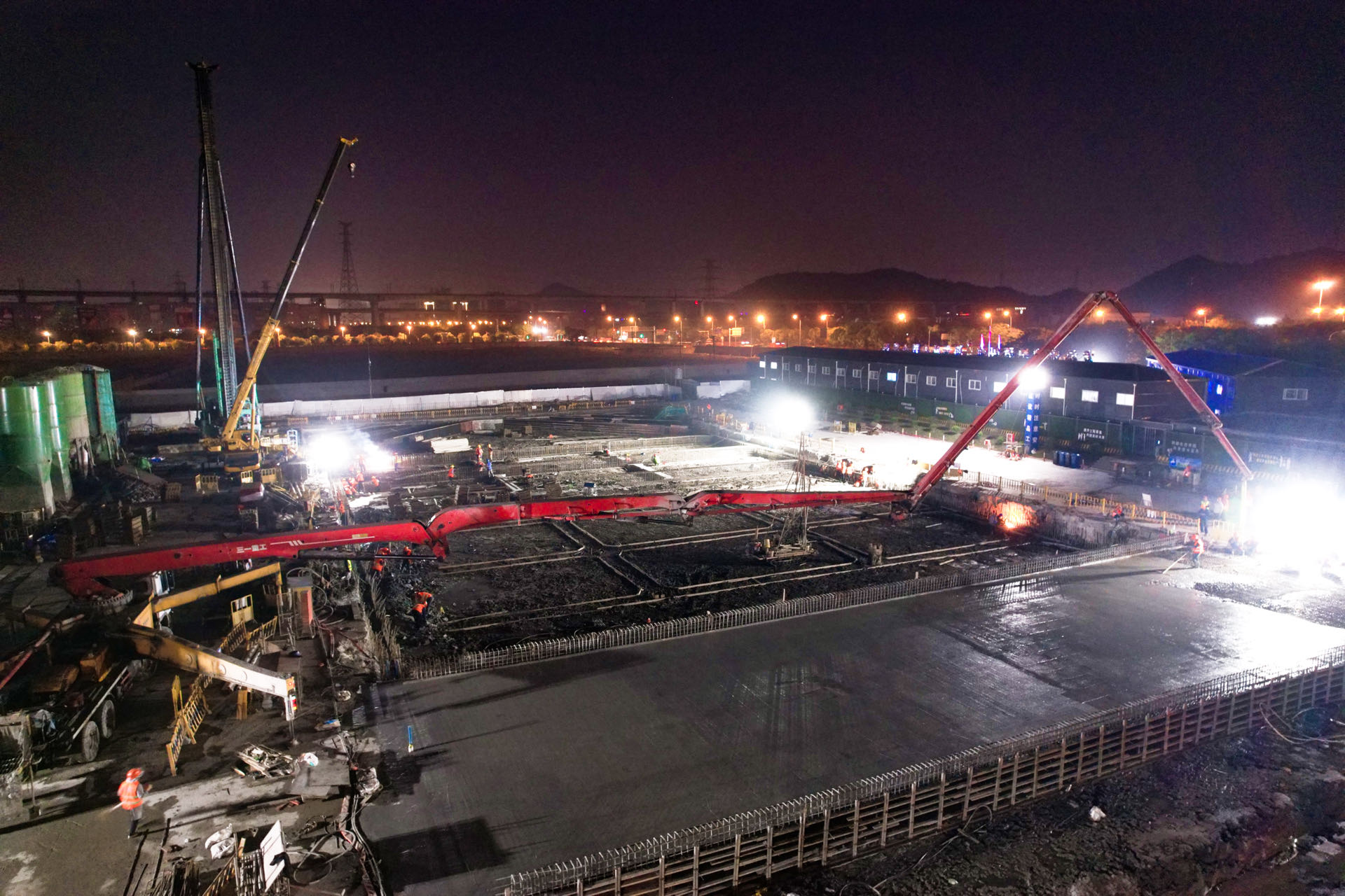 謝墅站位于北侖區(qū)江南中路小港互通北側,車站為10.5米站臺地下二層雙島式車站,主體基坑總長度約398米,標準段寬度37.7米,標準段基坑深度16.8米。面對超寬超長的主體結構,項目部基于自身施工經驗,邀請專家考察現場,聽取指導意見,反復優(yōu)化施工方案。項目部嚴抓安全生產,狠抓進度質量,克服梅雨季強降雨、高溫酷熱等惡劣天氣影響,分兩班24小時不間斷施工,最終實現底板5天一段、側墻4天一段、中板7天一段的工效,工程進度躋身寧波軌道交通近百個建設項目“第一方陣”,順利完成主體結構封頂。接下來,項目團隊將全面投入到附屬工程施工中,力爭早日建成該站點。