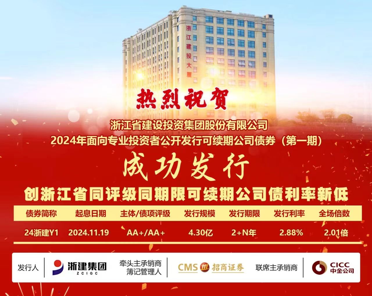 11月15日,由招商證券和中金公司承銷的浙建集團(tuán)2024年第一期可續(xù)期公司債成功發(fā)行,為集團(tuán)募得資金4.3億元,期限2+N年,票面利率2.88%/年。本次發(fā)行創(chuàng)浙江省同評級同期限可續(xù)期公司債的利率新低。